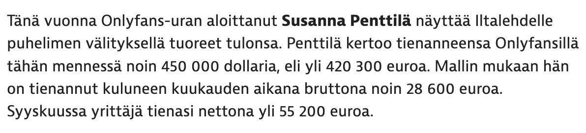 Penttilän lisäksi mm. missinä tunnettu Erika Helin kertoi tienanneensa Onlyfans tilauksilla jopa 12 000€ yhden kuukauden aikana ja normaalikuukautenakin tuhansia euroja. Jos näitä kommentteja on uskominen, niin ei mene kauaa, että Onlyfans tähtien nimiä alkaa löytyä verokoneesta.